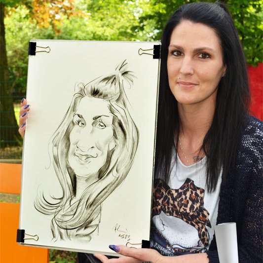 Wir waren sehr begeistert von deiner Leistung und unsere Kunden auch! Du siehst sehr gut die Eigenarten und Besonderheiten von Gesichtern und kannst diese perfekt aufs Papier bringen! Dein Auftritt war äußerst professionell.